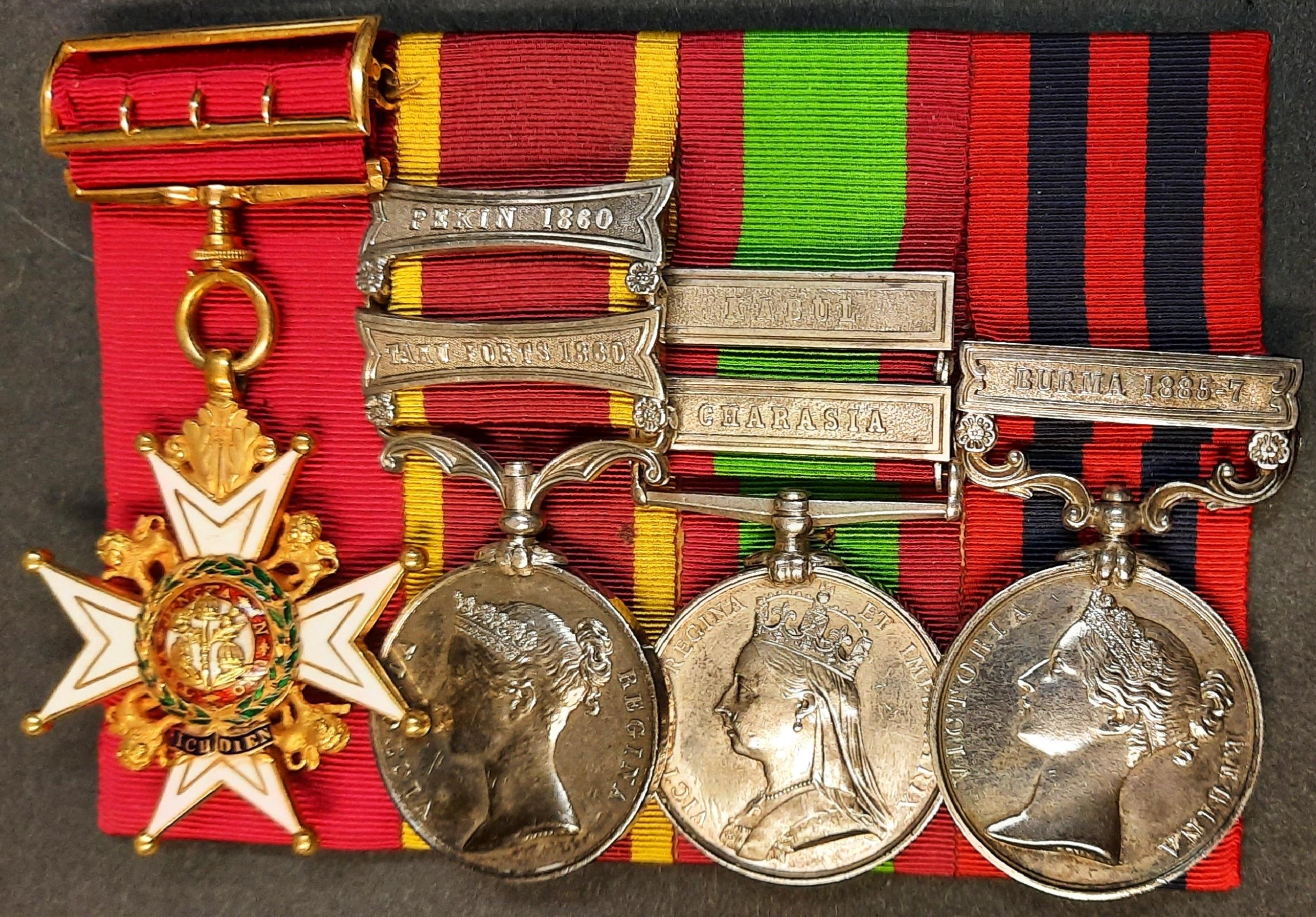 The medals are (from left to right): The Most Honourable Order of the Bath, C.B. (Military) Companion’s breast badge; the China War Medal 1857-1860 with clasps for Taku Forts 1860 and Pekin 1860; the Afghanistan Medal 1878-80 with clasps for Charasia and Kabul; and the India General Service Medal 1854-94 with clasp for Burma 1885-87.